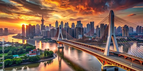 © Sirinporn, Obraz premium Stunning Chinese Cityscape: Suspension Bridge & Downtown Architecture at Dusk