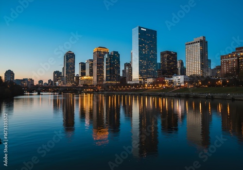 Obraz premium Stunning city skyline at blue hour, with illuminated skyscrapers reflecting...
