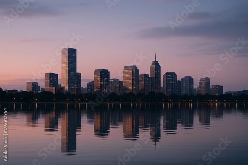 © NanzXy, Fototapeta premium Stunning City Skyline at Dusk with Reflections on Tranquil Water
