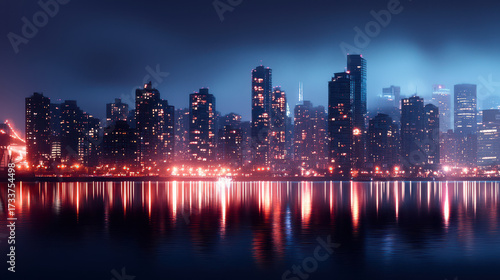 Fototapeta premium Stunning city skyline at night, illuminated by vibrant lights reflecting on...