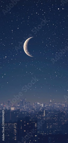 Naklejka premium Stunning city skyline at night under a crescent moon and twinkling stars, perfect for a vertical phone wallpaper