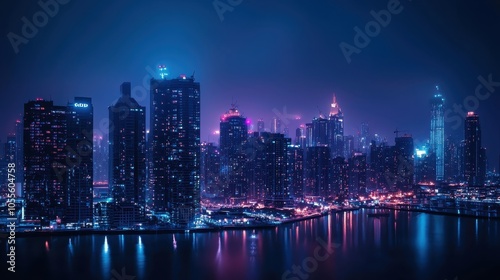 © Prichachai, Fototapeta premium Stunning city skyline at night with neon lights reflecting on the water, highlighting urban architecture and vibrant nightlife.