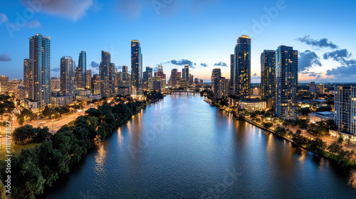 © siraphol, Fototapeta premium stunning city skyline at night with vibrant lights reflecting on water