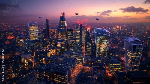 Obraz premium Stunning city skyline at sunset. Buildings glow with lights. Helicopters hover above the urban landscape. A breathtaking view of city life.