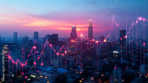 © ชลธิชา สว่างวงค์, Fototapeta premium Stunning city skyline at sunset with digital graphs, symbolizing finance and technology in a vibrant urban landscape.