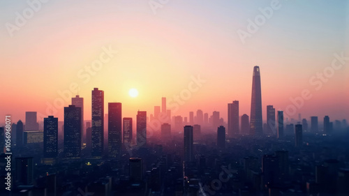Fototapeta premium Stunning city skyline at sunset with skyscrapers and vibrant colors