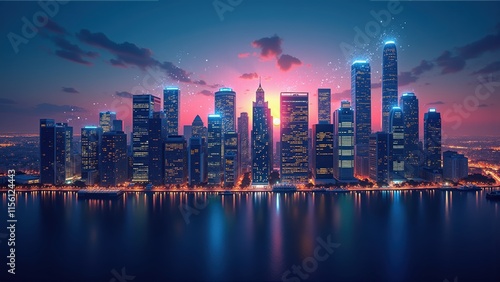 Naklejka premium Stunning city skyline at twilight with vibrant colors reflecting on the...