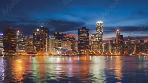 © Rony, Obraz premium Stunning city skyline illuminated at night, reflecting on the calm waters