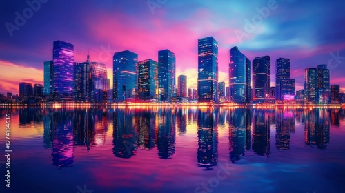 © Tuachan, Obraz premium Stunning City Skyline Reflection at Dusk with Colorful Lights