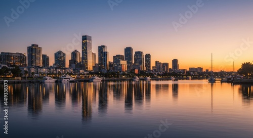 © Taqinaya, Fototapeta premium Stunning City Skyline Reflection on Water During Sunset in Urban Waterfront