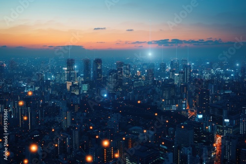 Fototapeta premium Stunning cityscape at dusk, showcasing glowing skyscrapers and vibrant lights...