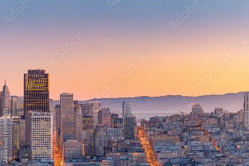 © SolaruS, Fototapeta premium Stunning cityscape at sunset. Golden hour light bathes a vibrant city skyline, offering a captivating blend of urban architecture and natural beauty.