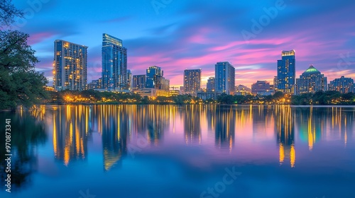 © VeloonaP, Naklejka premium Stunning cityscape at sunset with colorful sky, tall buildings, and their reflections on a calm lake in the foreground.