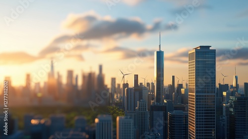 Fototapeta premium Stunning Cityscape at Sunset with Towering Skyscrapers and Wind Turbines in a Modern Urban Environment