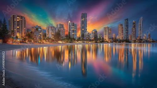 Naklejka premium Stunning cityscape of Gold Coast Australia at night with vibrant reflections...