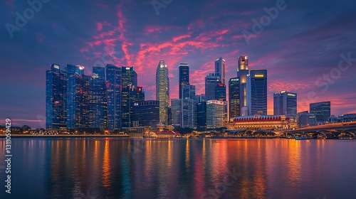 Fototapeta premium Stunning cityscape of Singapore at twilight with vibrant sky and reflections on the water