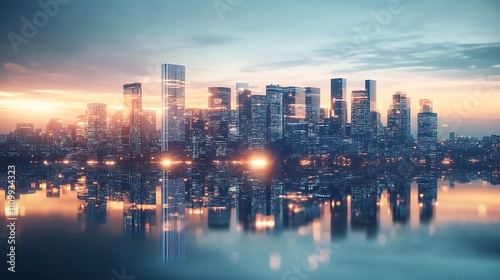 Fototapeta premium Stunning cityscape reflected in calm water at sunset.