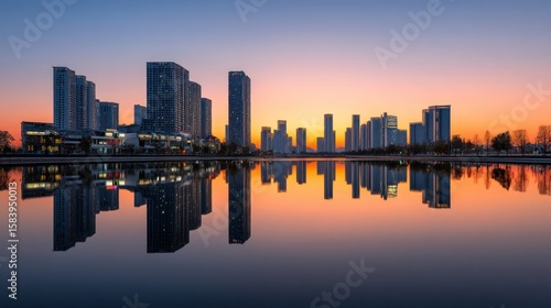 © abdul kahfi, Fototapeta premium Stunning cityscape reflection at sunset modern architecture urban skyline panorama