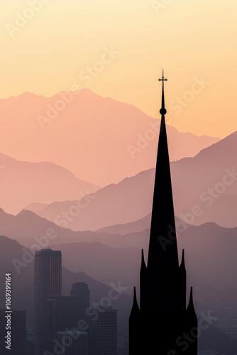 Obraz premium Stunning Cityscape Silhouette Against Sunset and Mountain Backdrop