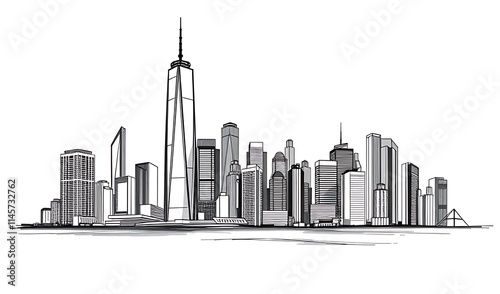 © heinng, Naklejka premium Stunning Cityscape Sketch: Monochrome Illustration. AI Generated