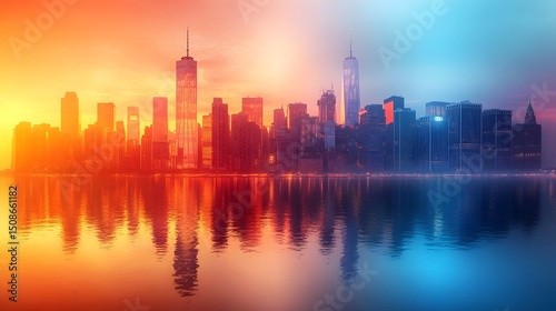 © Everything by Rachan, Fototapeta premium Stunning Cityscape Skyline Reflecting on Water at Sunset