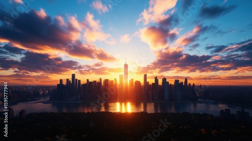 Naklejka premium Stunning cityscape sunset over a modern skyline with vibrant clouds and...