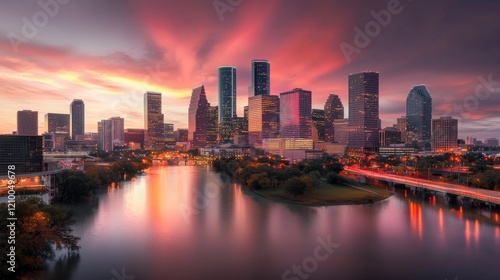 © ADD PHOTO, Fototapeta premium Stunning Cityscape with Illuminated Skyscrapers and Dramatic Sunset Sky