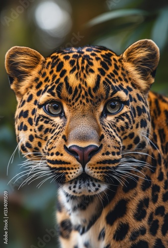 © ANUAR, Fototapeta premium Stunning Close-Up of a Beautiful Leopard With Distinctive Spots and Intense Gaze Surrounded by Lush Greenery in a Natural Habitat Setting