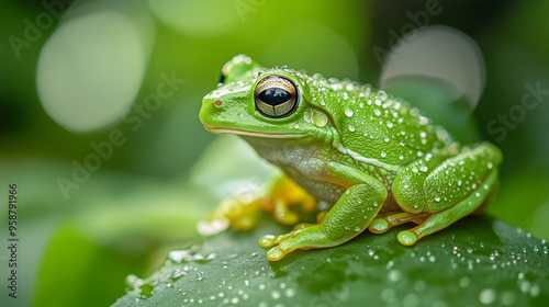 © XtravaganT, Naklejka premium Stunning Close-Up of a Green Frog with Dew Drops in its Natural Habitat