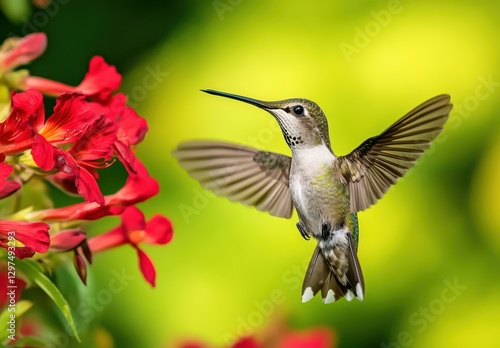 Naklejka premium Stunning Close-Up of a Hummingbird Hovering Near Vibrant Red Flowers in a Lush Garden Setting, Showcasing Nature's Beauty and Delicate Features
