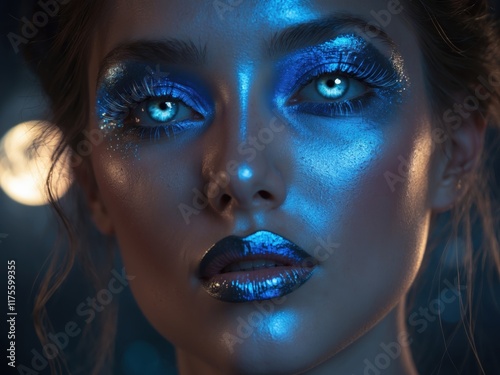Fototapeta premium Stunning close-up of a model with dramatic blue makeup and striking reflective features under soft lighting at an evening event