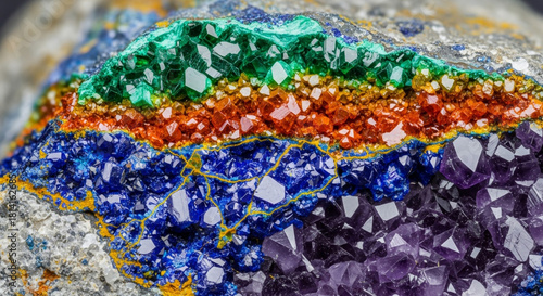 © Madihabibi, Obraz premium Stunning close-up of colorful crystal formations in vibrant shades of green, orange, blue, and purple creating a unique mineral rainbow pattern