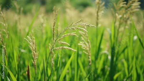 © RABBI, Obraz premium Stunning Close-Up of Tall Grass Meadow, Lush Green Blades, Seed Heads, and Dry Stalks Swaying Gently in Sunny Day Light