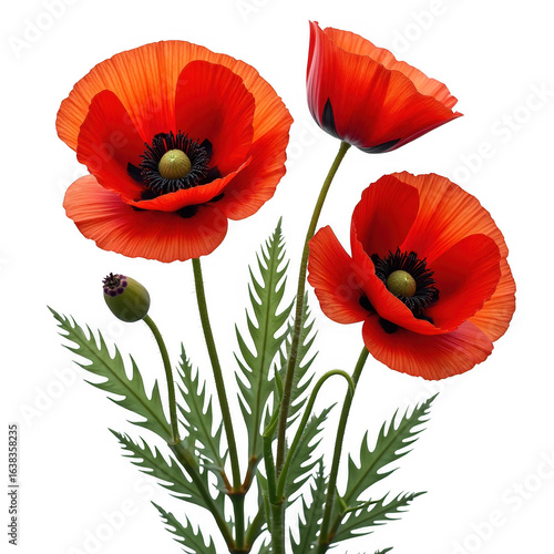 © Abir, Obraz premium Stunning close up photography of vibrant red poppy flowers with dark green leaves transparent background