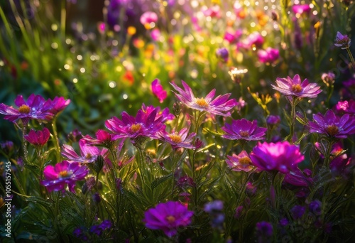 Naklejka premium stunning close vibrant dew kissed wildflowers surrounded lush greenery...