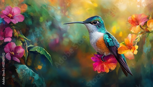 © Nattapat, Obraz premium Stunning closeup of a vibrant hummingbird resting on a bright flower, with a backdrop of a lush tropical rainforest teeming with colorful blooms and greenery