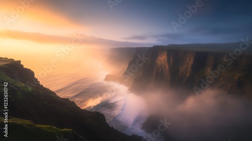 Fototapeta premium Stunning coastal cliffs with crashing waves under a dramatic sunset sky.