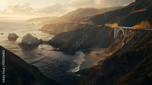 Obraz premium Stunning Coastal Landscape with Bridge and Sunset Sky