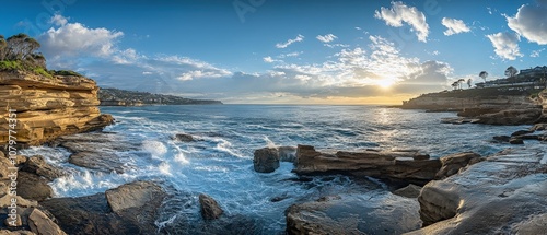 © Aashutosh Pandit, Obraz premium Stunning coastal landscape with dramatic cliffs, crashing waves, and a breathtaking sunset over the ocean