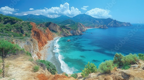 Fototapeta premium Stunning coastal scenery with vibrant turquoise waters, dramatic cliffs, and lush vegetation