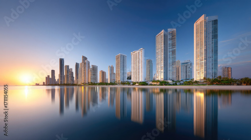Obraz premium Stunning coastal skyline featuring modern skyscrapers reflecting in calm...