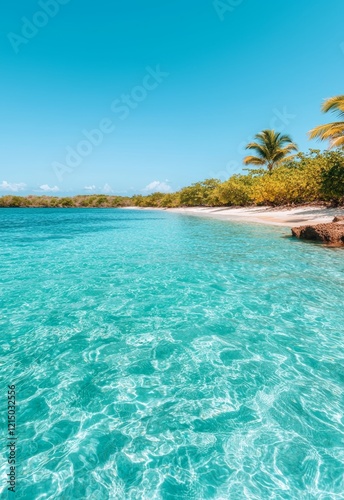 Naklejka premium Stunning Coral Reefs by a Serene White Sandy Beach Under a Clear Blue Sky