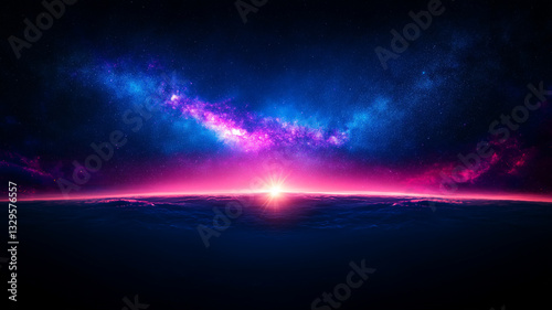 Naklejka premium stunning cosmic landscape featuring vibrant nebula and stars, with radiant sunrise illuminating horizon. colors blend beautifully, creating sense of wonder and tranquility