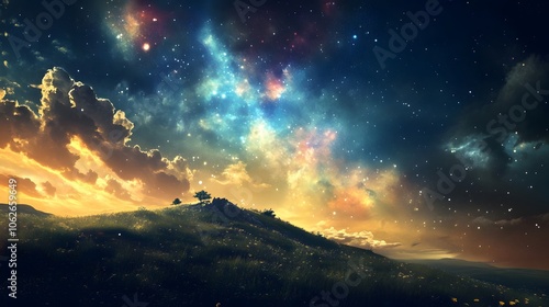 Fototapeta premium Stunning cosmic landscape with vibrant colors and stars at dusk.
