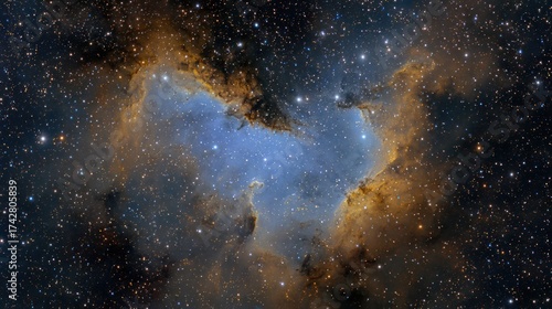 © Alunn cans, Fototapeta premium Stunning cosmic nebula with vibrant blue and golden dust clouds, a celestial spectacle in deep space, featuring countless stars