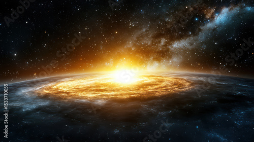 © siraphol, Fototapeta premium Stunning cosmic scene featuring golden galaxy core illuminating dark space around it