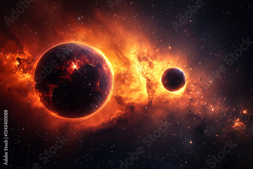 Obraz premium Stunning cosmic scene featuring two vibrant planets amidst a fiery nebula...