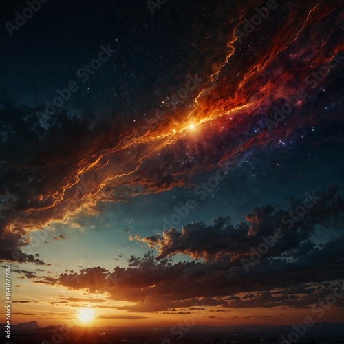 © Lin, Fototapeta premium Stunning cosmic sunrise with vibrant colors illuminating the sky over distant mountains