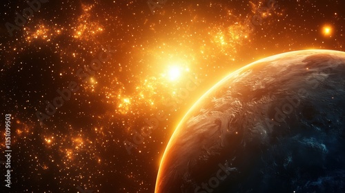 © Vergiliy, Fototapeta premium Stunning cosmic view of planet with glowing stars and bright sun in deep space