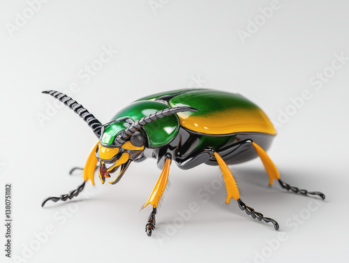 © PHAISITSAWAN, Naklejka premium Stunning 3d illustration of a green and yellow beetle highlighting its distinctive features against a bright background